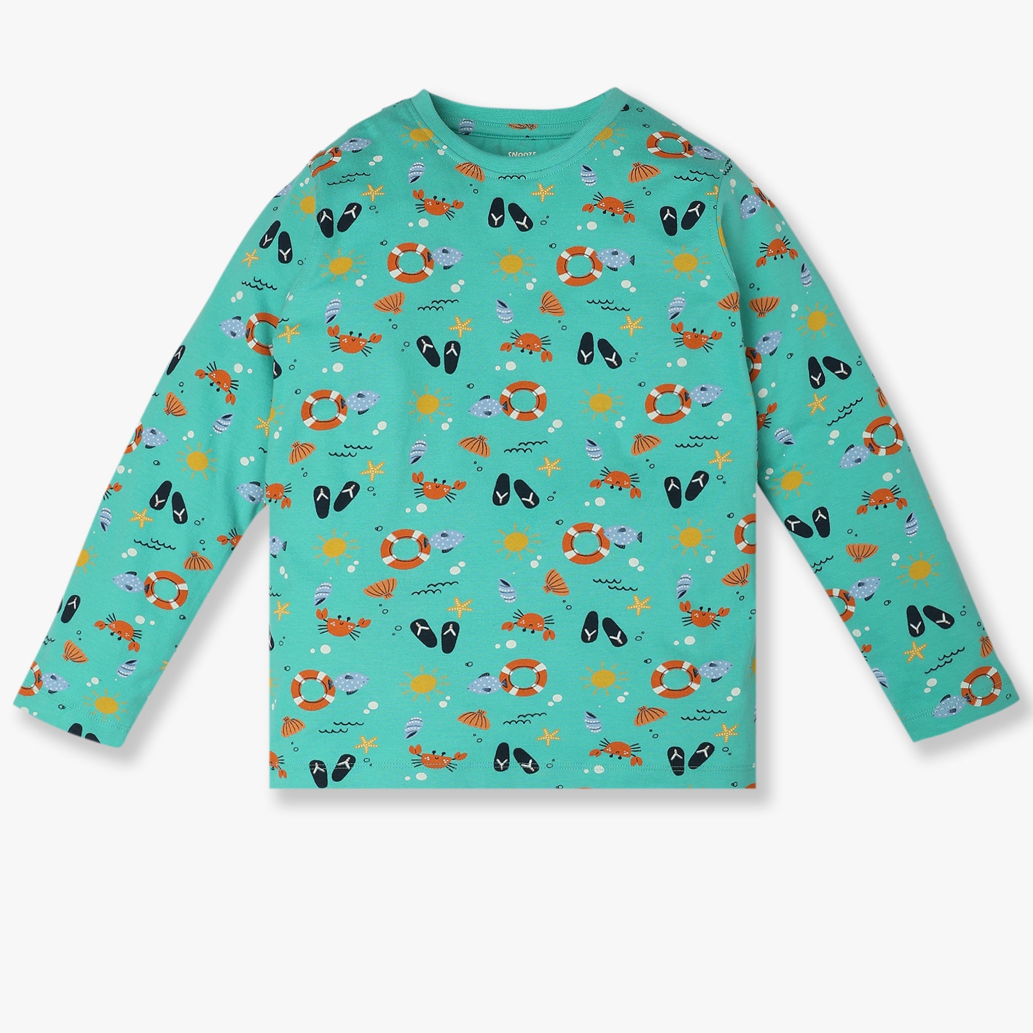 These printed pattern t-shirt with pyjama sleepwear set has crew neck and full sleeve. Made from cotton, your kid's feel comfortable wearing the product.