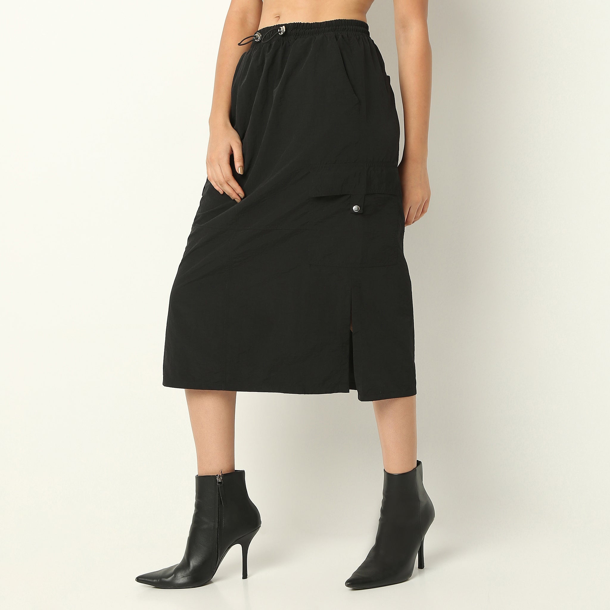 Experience the perfect blend of comfort and style with our Regular Fit Solid Calf Length Mid Rise Skirt. Crafted from 100% nylon, this skirt offers a smooth and lightweight feel, making it an ideal choice for any occasion. Its solid pattern and mid-rise waist provide a versatile look that can easily transition from day to night.