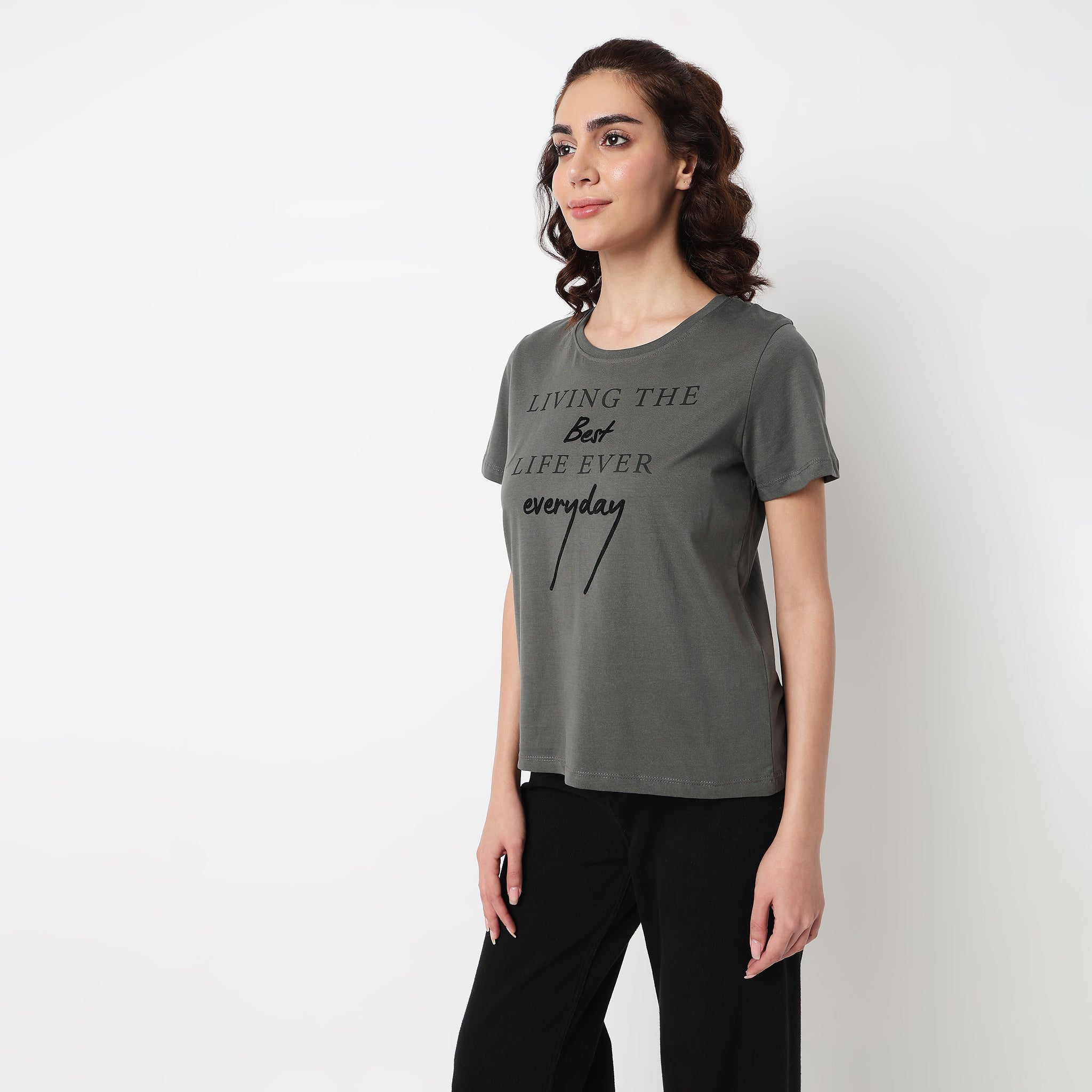 Introducing the Cotton Crew Neck Graphitee T-Shirt, designed for women who value comfort and style. This versatile piece features a striking graphic pattern on soft cotton fabric, making it perfect for casual outings or laid-back days at home.