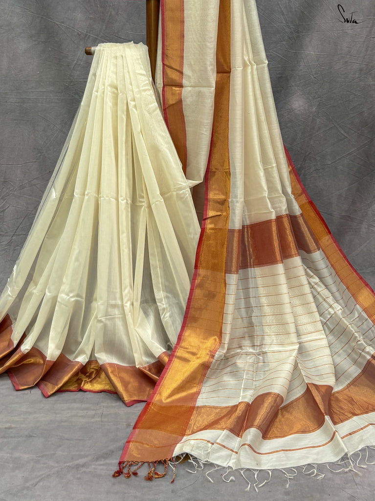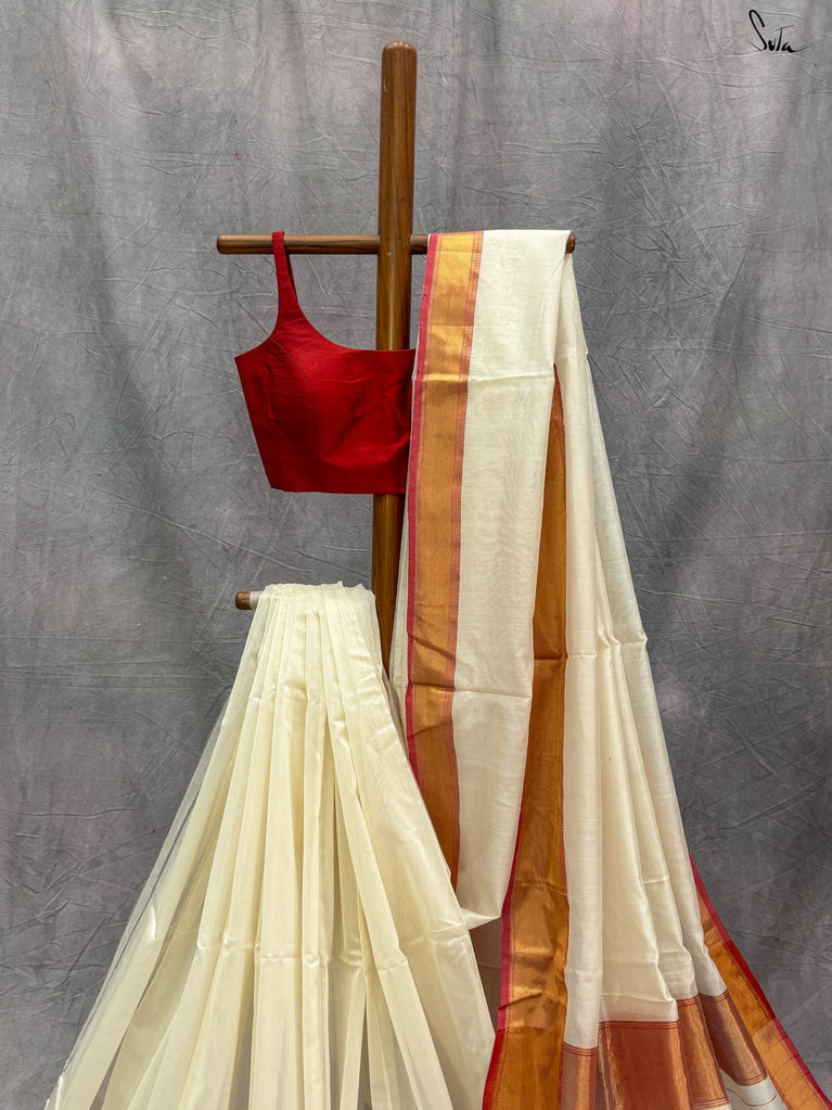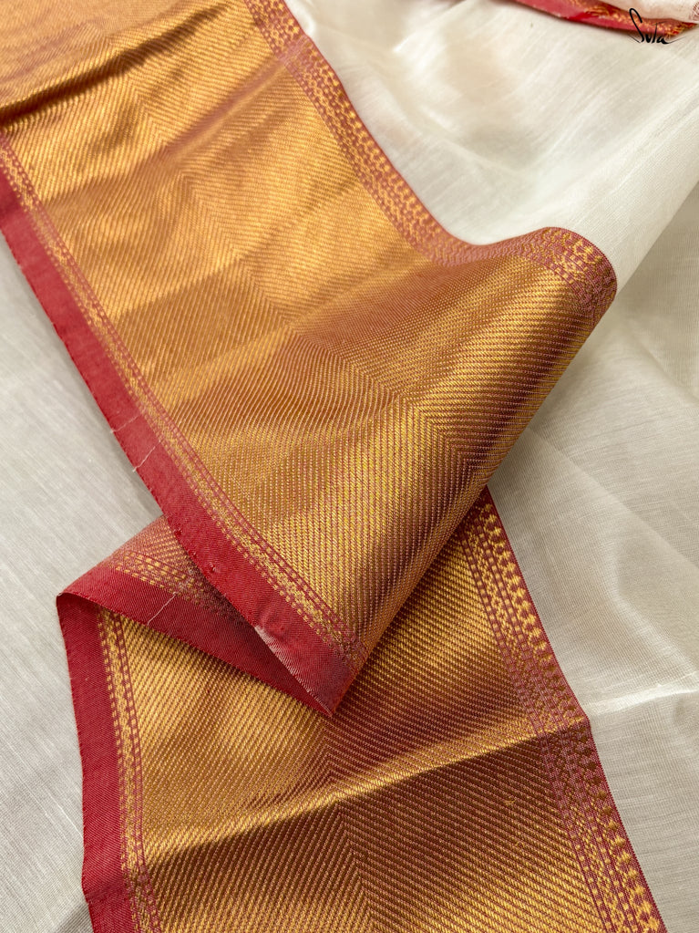 Off-white cotton viscose forms the base for a captivating print, showcasing illustrations of women engaged in various Onam festivities. The artwork brings the spirit of the harvest festival to life, while a classic gold zari border frames the design with a touch of elegance.