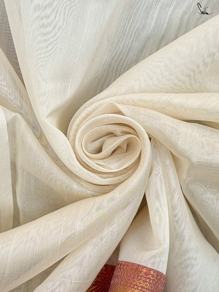 Our ‘made in heaven’ mul cotton, is also known as mul mul in West Bengal. The fabric is buttery soft and has a delicate beauty. Its weave is very fine and this lends a very fluid texture to the fabric, which makes draping it a breeze. It truly is like a hug that wraps you in its love. The addition of zari adds a regal sheen to this saree, making it as beautiful as it is comfortable.