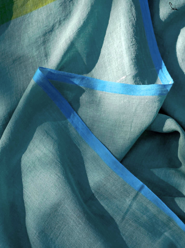 Embrace yourself as you are, for who you are, in this striking blue and green cotton saree with zari detailing.