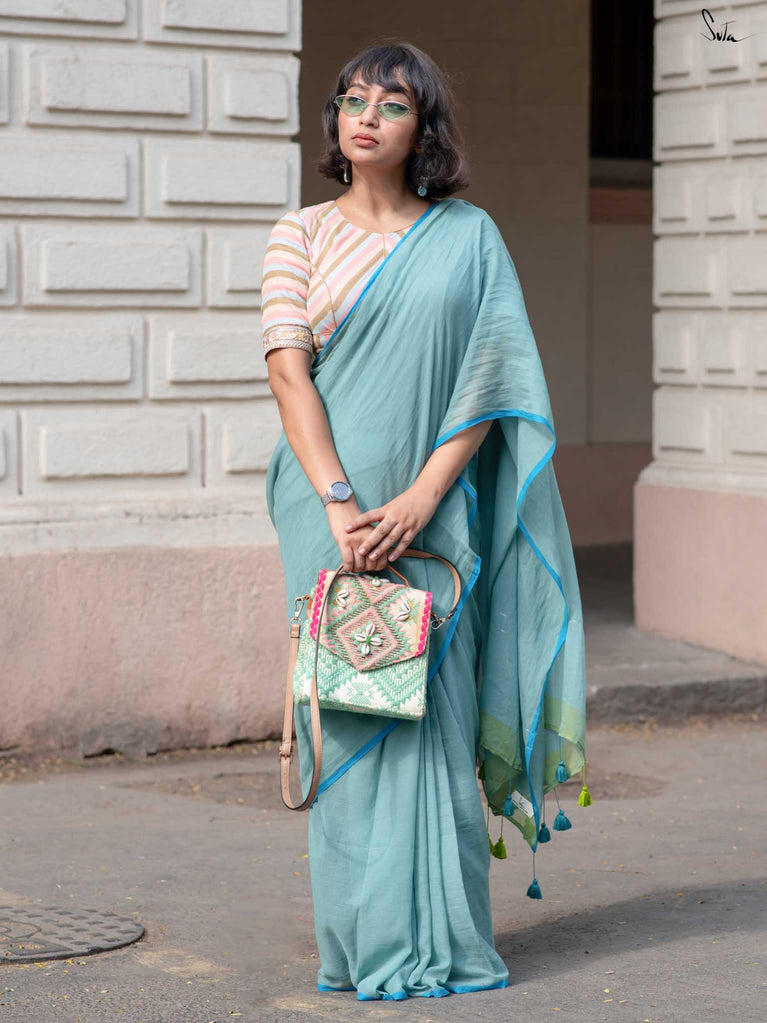 Like silver linings- bright and hopeful, this light blue mul cotton saree is all about easy elegance. The contrast selvedge adds a touch of character, and the zari lines on the pallu catch the light most softly. A pop of lime green and matching tassels bring in a fresh, summery surprise. Perfect for daytime events, office parties, or lunches that turn into laughter-filled afternoons.