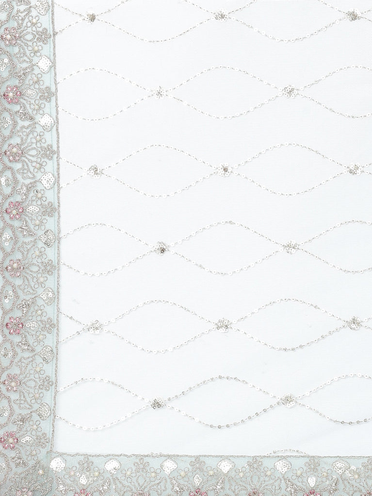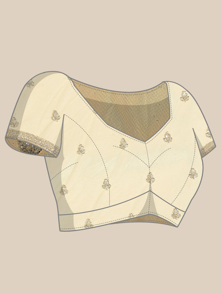 This cream net saree features intricate hand embroidery accented with pearls and sequins, creating a delicate and refined look. The scalloped border adds a sophisticated finish, enhancing its elegance. Ideal for formal occasions, this saree combines traditional craftsmanship with contemporary design for a graceful ensemble.