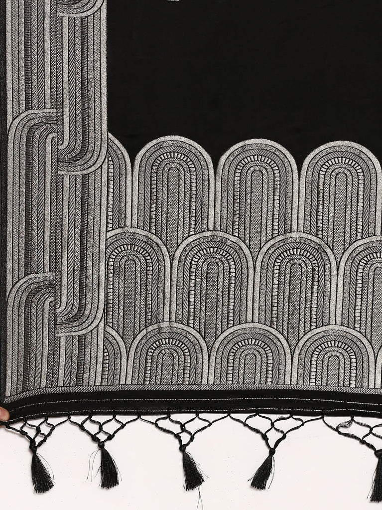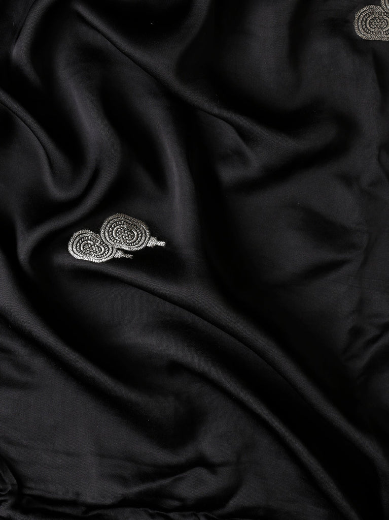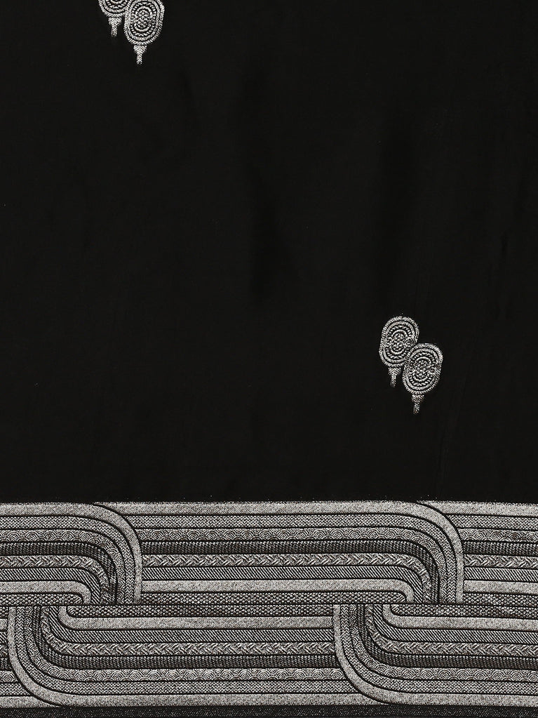 Embrace timeless elegance with this black Banarasi silk saree featuring exquisite silver zari motifs and a detailed border. Its rich fabric and shimmering design make it perfect for special occasions, ensuring you stand out with grace and sophistication. Comfortable and luxurious, this saree adds a classic touch to your wardrobe.