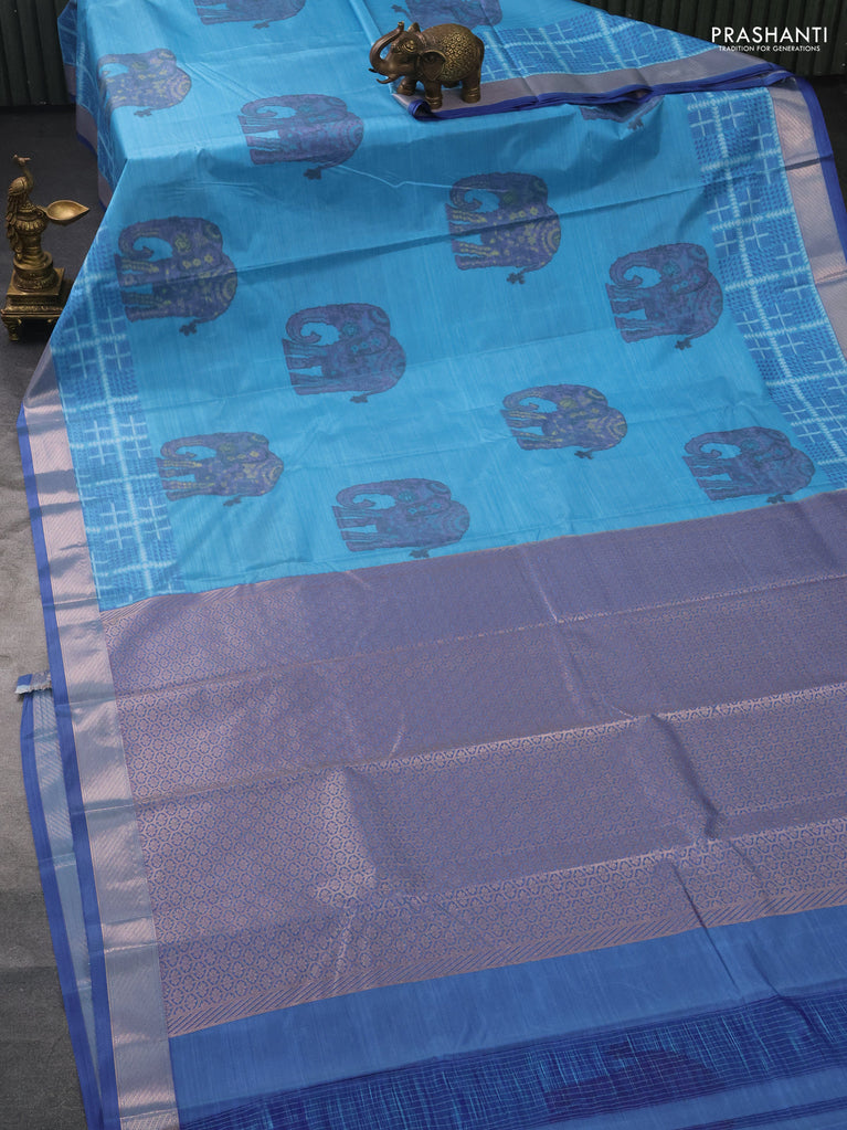 Bangalori semi silk saree light blue with allover elephant ikat butta weaves and zari woven border