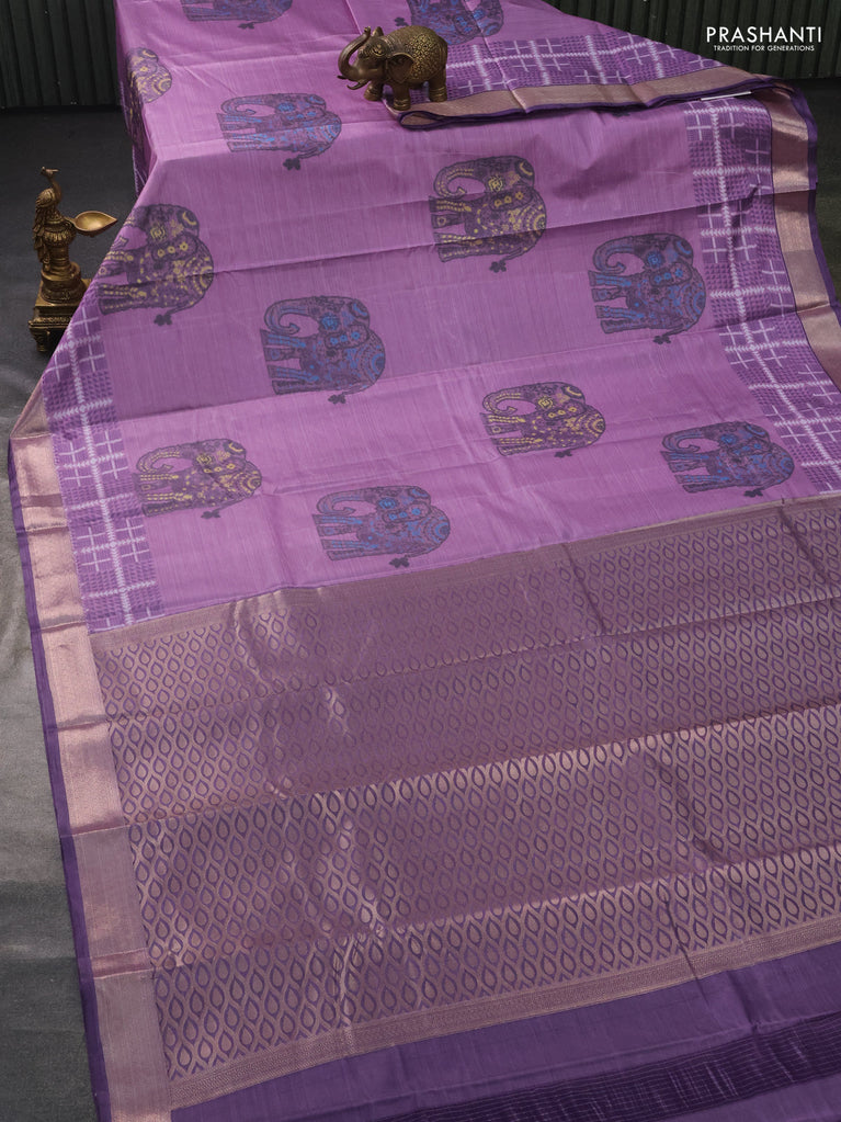 Bangalori semi silk saree mild purple and purple with allover elephant ikat butta weaves and zari woven border