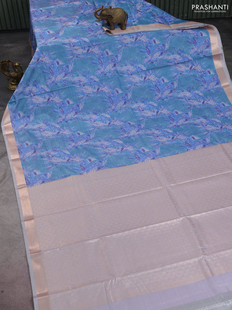 Bangalori semi silk saree off white and blue with allover ikat weaves and zari woven border