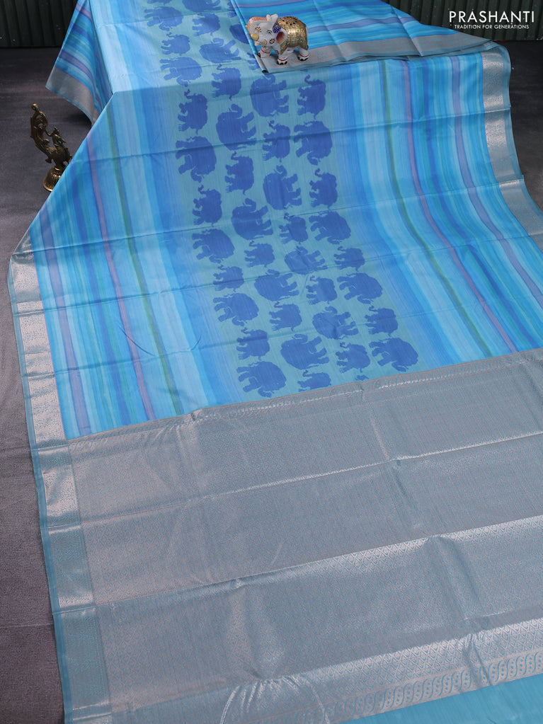 Bangalori semi silk saree pastel blue with allover elephant butta ikat weaves and zari woven border