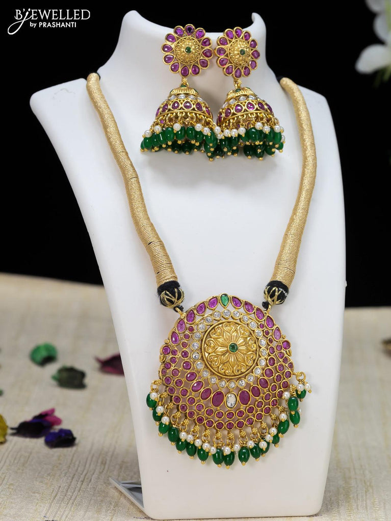 Black thread necklace with kemp stone lakshmi pendant and green beads hanging without earrings
