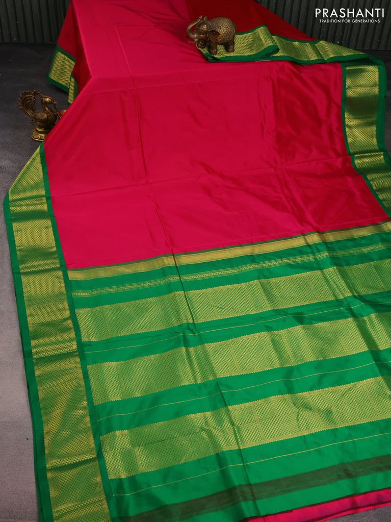 10 Yards silk saree reddish pink and green with plain body and temple design zari woven border