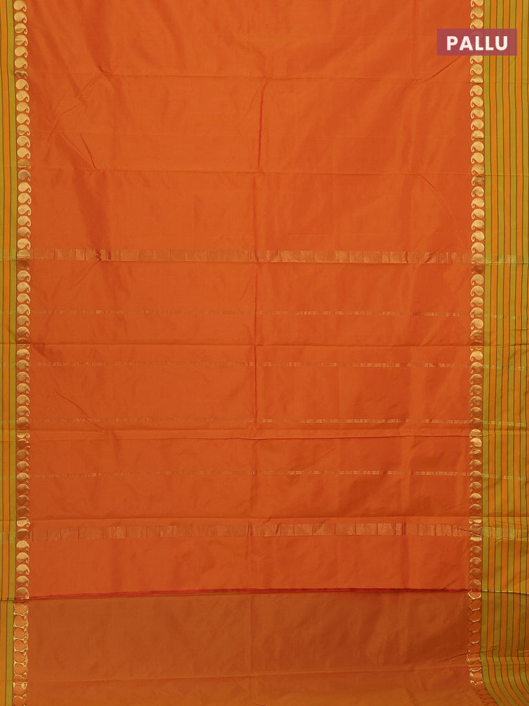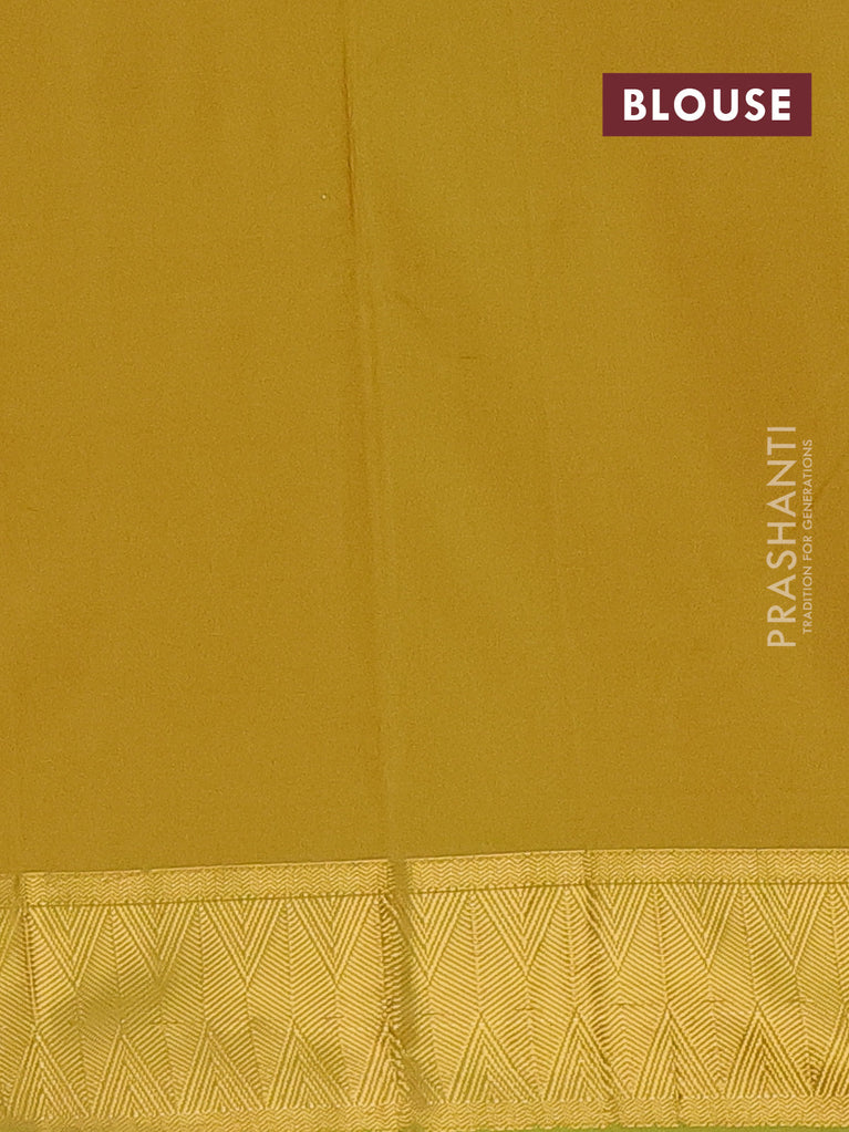 Arani semi silk saree dual shade of mustard yellow and light green with plain body and paisley zari woven simple border