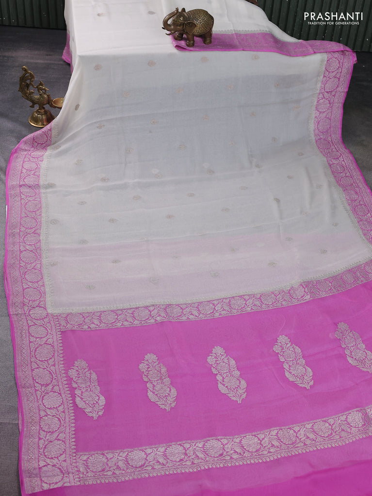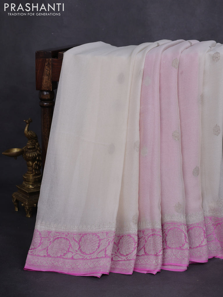 Banarasi chiffon silk saree off white and lotus pink with silver zari woven buttas and floral silver zari woven border