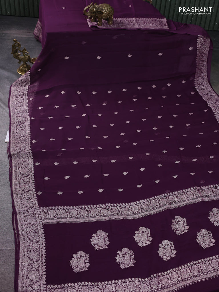 Banarasi chiffon silk saree violet with silver zari woven buttas and silver zari woven border