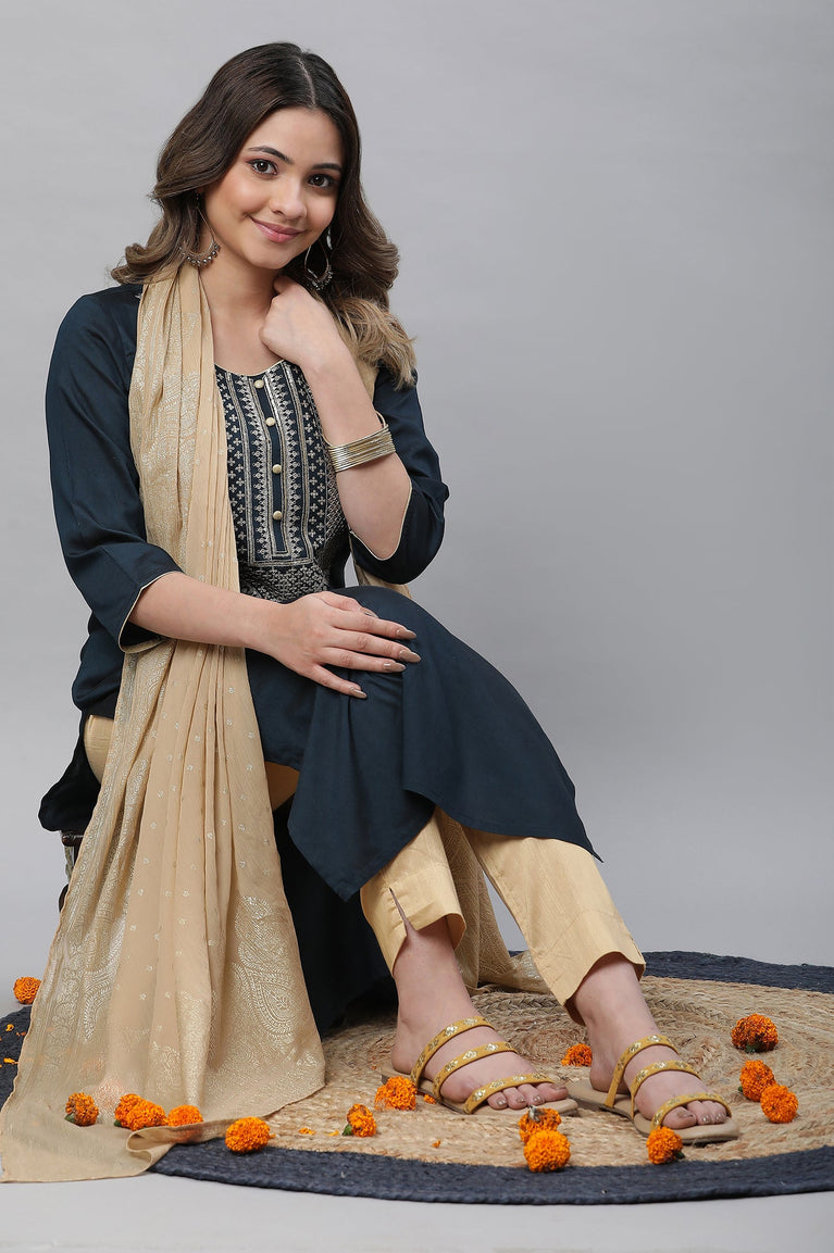 Peacock blue coloured round solid straight kurta having zari embroidery, round neck and three-quarter sleeves. To complement, the set contains matching palazzos with elasticated waistband and a contrasting golden coloured dupatta.