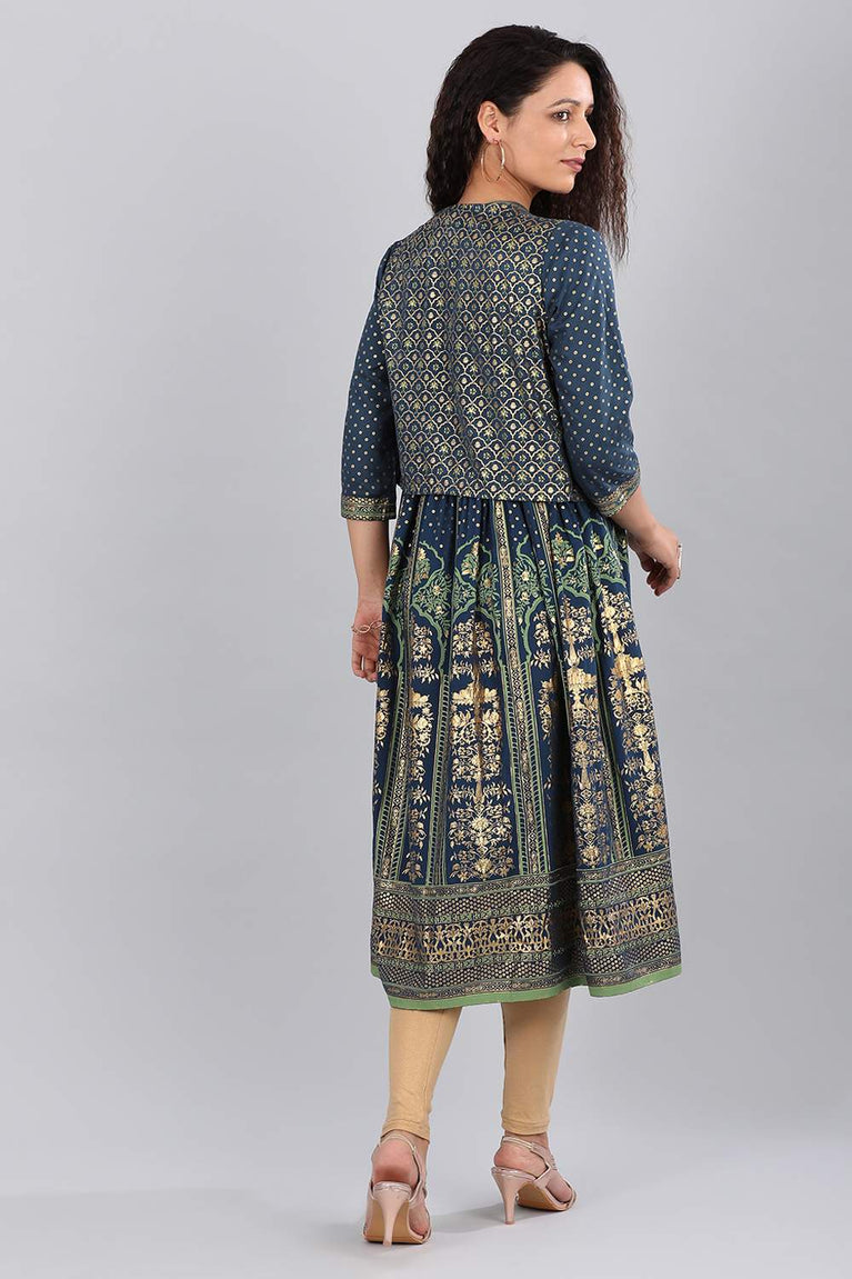 This stylish contemporary set is a must-have for your summer wardrobe. This set includes blue fit and flare Gillet with gathers. The set also includes printed strappy kurta and solid trousers.
