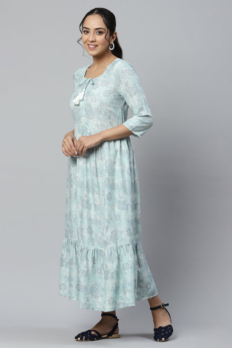 Blue gathered dress in round neck with V and 3/4th sleeves.