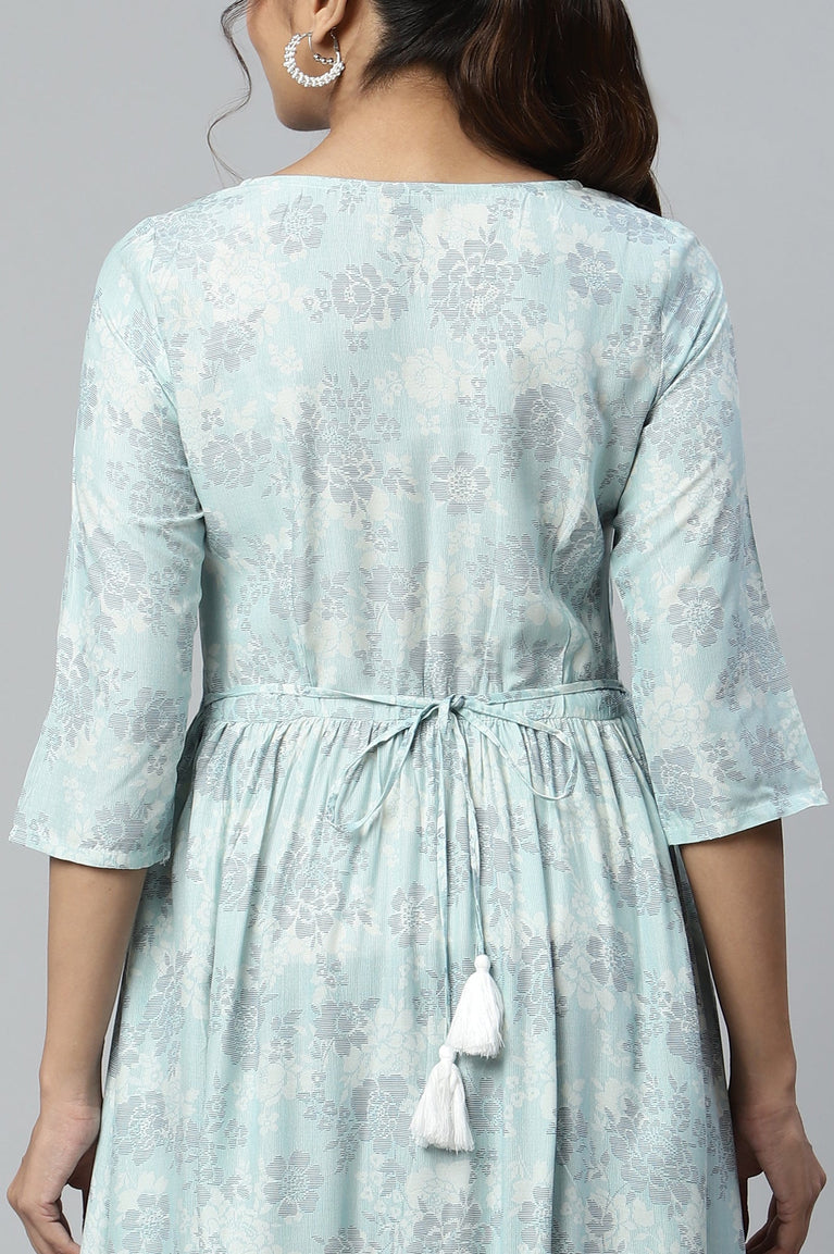 Escape the regular day with this aqua colour kurta set. This style has a close neck mandarin collar with the perfect amount of embellishment at the neck. The beautiful florals in the makes print elevates the silhouette and gives elegance, festive and grace - all in one vibe.