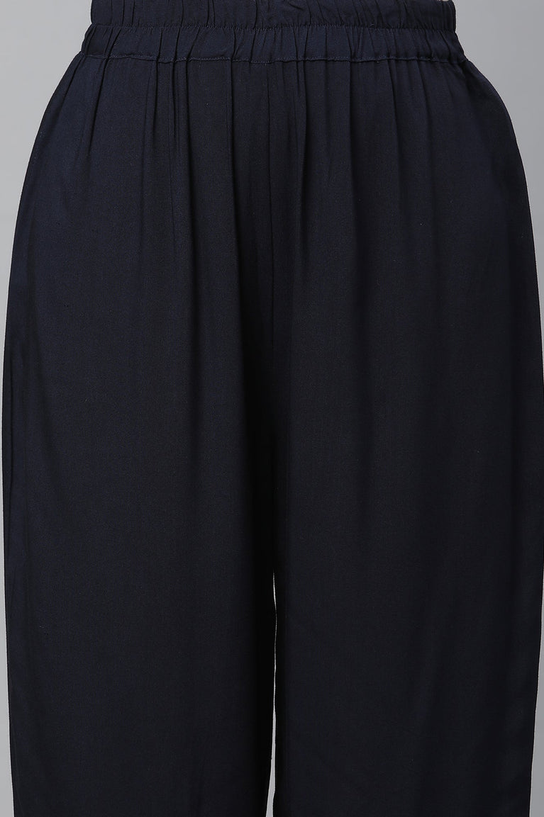 Chic ensembles designed to make you look gorgeous on the upcoming festivities. It features a blue glittered geometric print kurta having zari and thread embroidered round neck and three-quarter sleeves. Well-matched with ankle length slim fit solid trousers.