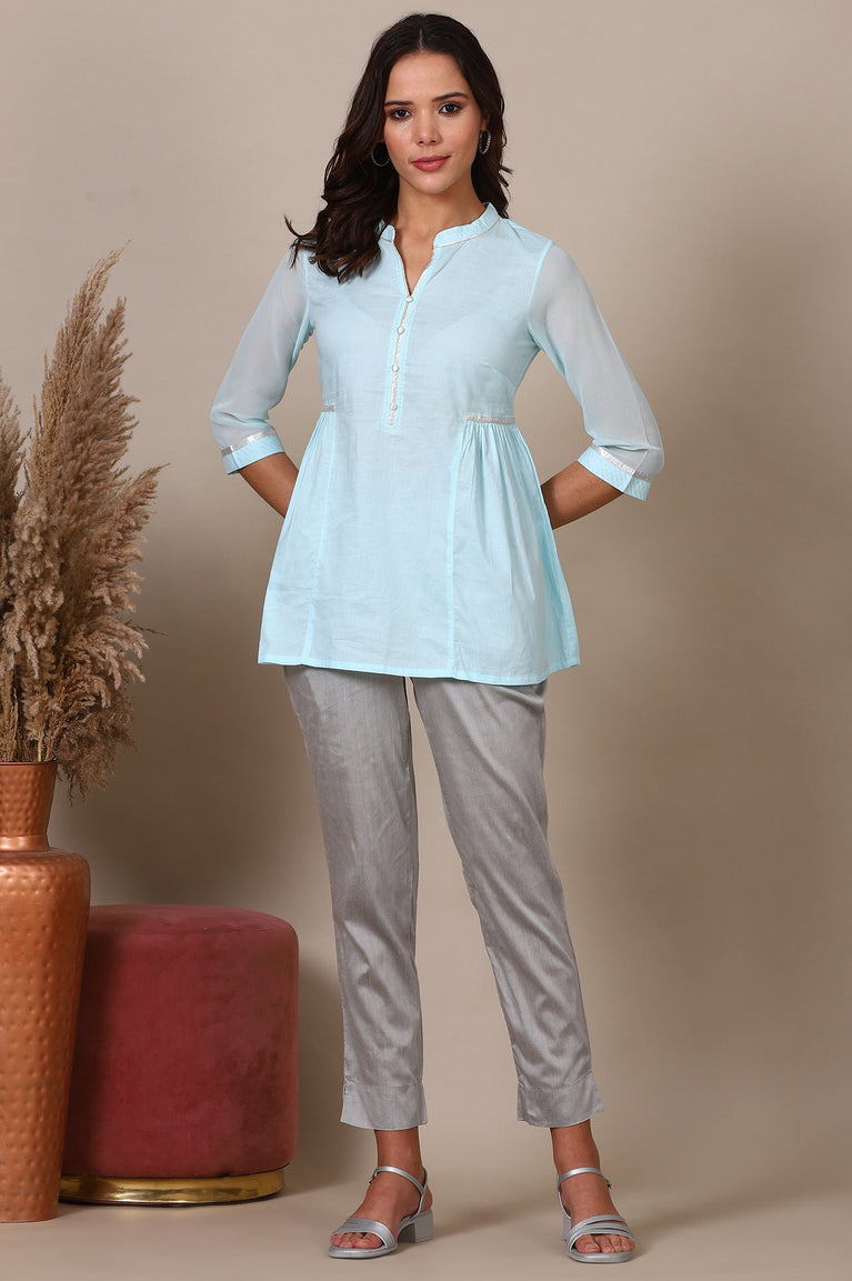 Get a smart office lunch look in this pretty and chic blue gathered kurta set. The set has solid cotton kurta with elegant details. It is paired with grey solid trousers.
