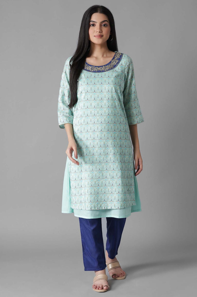 Festivities delve for contemporary attires with delightful hues, striking motifs and intricate detailing. This kurta set features a light blue glittered mughal print layered A-line kurta having zari embroidered yoke with round neckline and three-quarter sleeves. Well-matched with slim fit solid trousers.