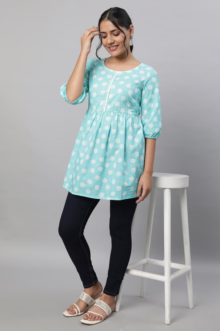 Go out this summer with this soothing blue cotton short kurti and denim set. The kurti has polka dot print and further accentuated with lace. It is paired with blue denim slim fit jeggings.