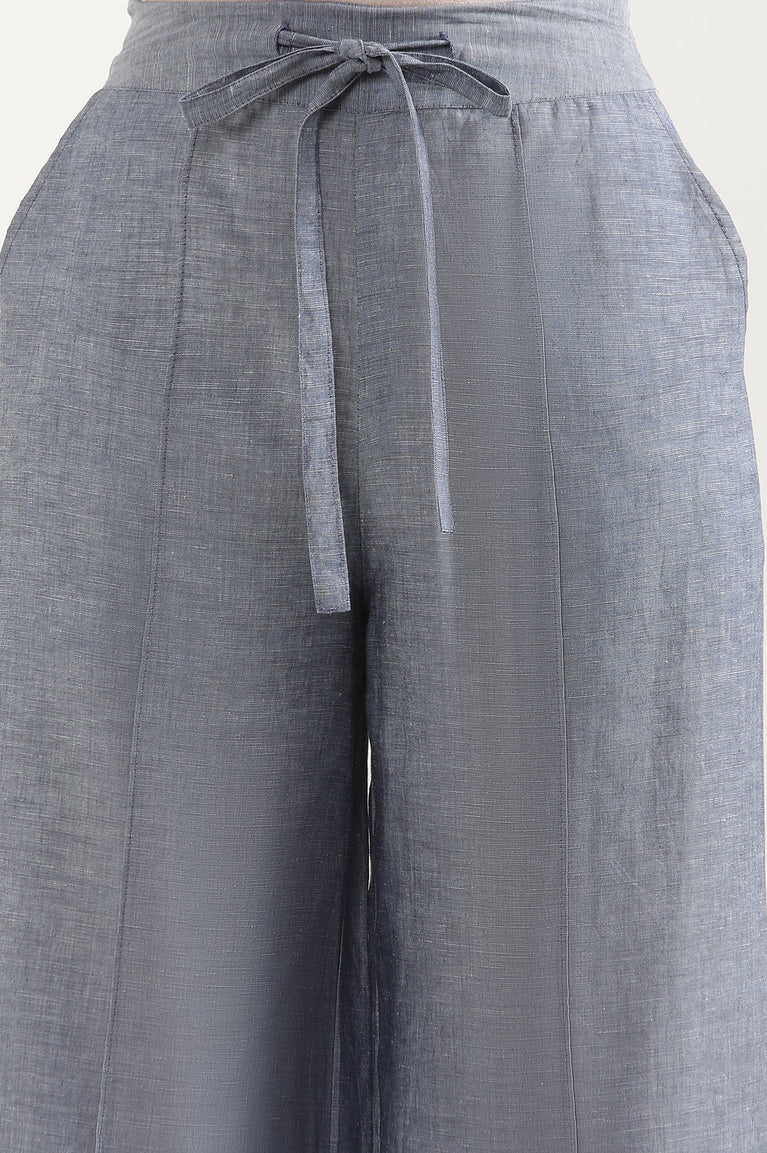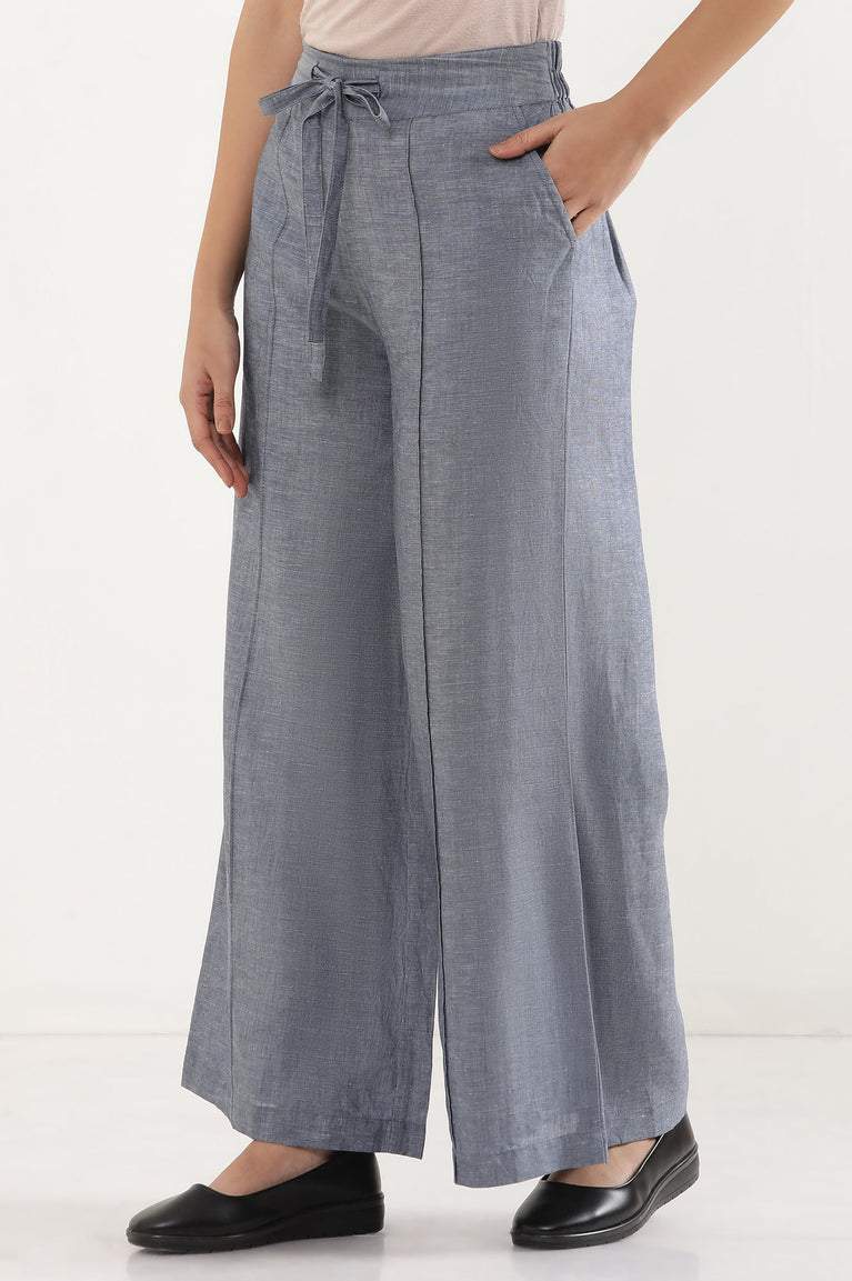 Blue Solid Flared Cotton Pants With Elasticated Waist