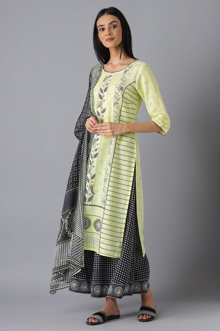 Crafted with micro-pleated precision, this black flared sharara offers a blend of comfort and style. The partial elasticized waist belt ensures a snug fit, while the two functional side seam pockets add practicality. Perfect for festive occasions, this woven sharara can be paired with a kurta, kurti, short tops, or crop-tops for a versatile look.