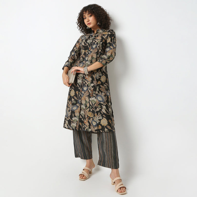 Band Collar Knee Length Three-Fourth Sleeve Flare Fit Printed Kurta With Pant Set