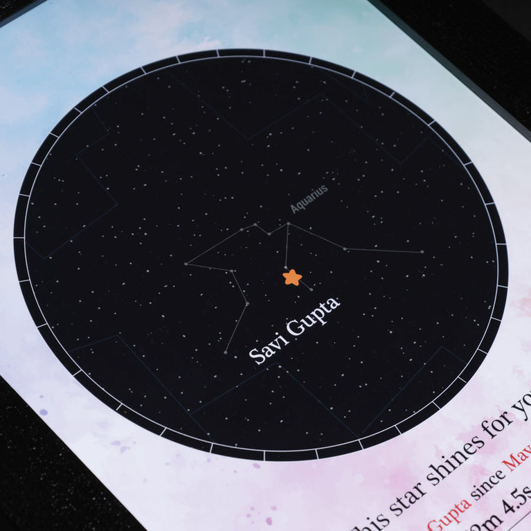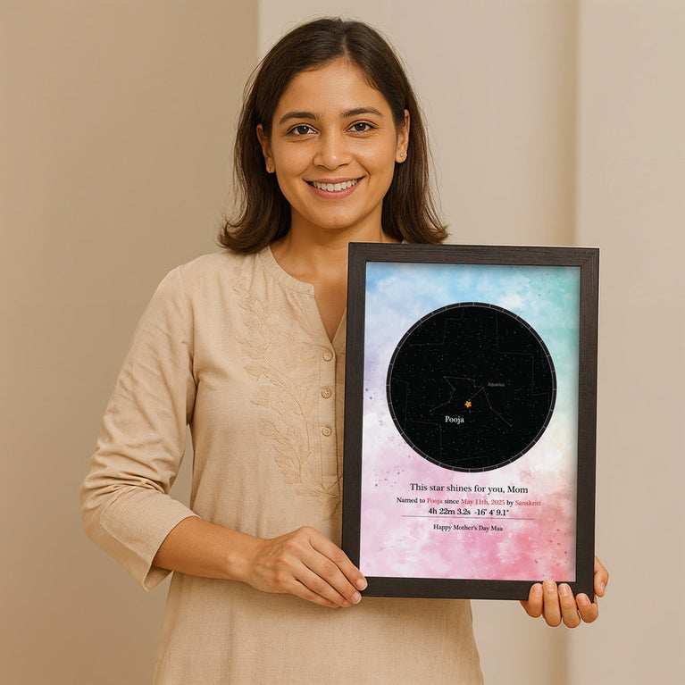 Moms are the guiding light of our lives. They deserve the universe. Let's give them one then.Name a star after your mom and frame it with love, complete with her name and constellation details. Simply share her name, select the zodiac and the date, and a star will be named exclusively for them.The star comes customized with your mother's name and a constellation chart showcasing the exact location of the star. You can also add a personalized message to make it even more touching. How does 'Name a Star' actually work? This unique service utilizes the 'Star Dedication Archive,' a comprehensive database of recognized stars in our solar system with their precise coordinates. Once a star is dedicated, it receives a special name and a certificate is generated for it. The registration number on the certificate provides exclusive access to the star's details in the archive, ensuring that no other star will bear the same name. Specifications -Size of the frame with glass - A3 (29.72 x 41.91 cm)Please note that Oye Happy is a facilitator for the naming service, GiftYourStar, which is an Accredited Registrar of the Star Dedication Archives. The star can only be booked for the current year, not for previous years. If you input the date of the occasion as 17/03/1987, the star will automatically be booked for the current year, regardless of the entered date. If the sender's name is not provided, we will list it as "Star is named by Special Person" on the certificates