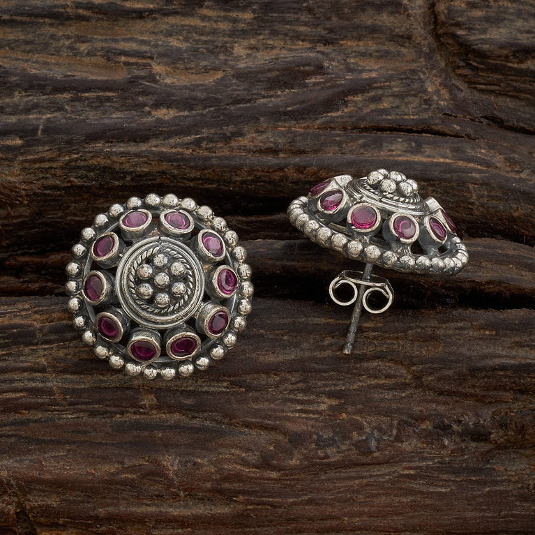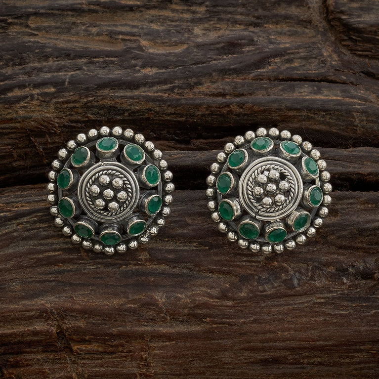 Kushal's Fashion Jewellery 92.5 Pure Silver Flower Motif Silver EarringThe best part of accessories with a polish of oxidised silver is that they blend well with traditional and fancy occasions, which is why we present our latest pair of 92.5 silver earrings in black polish. These stud earrings offer intricate work details with green and ruby stones, and the polish ensures to make all heads turn toward you.
