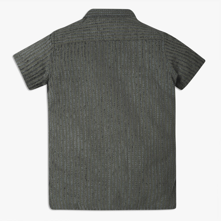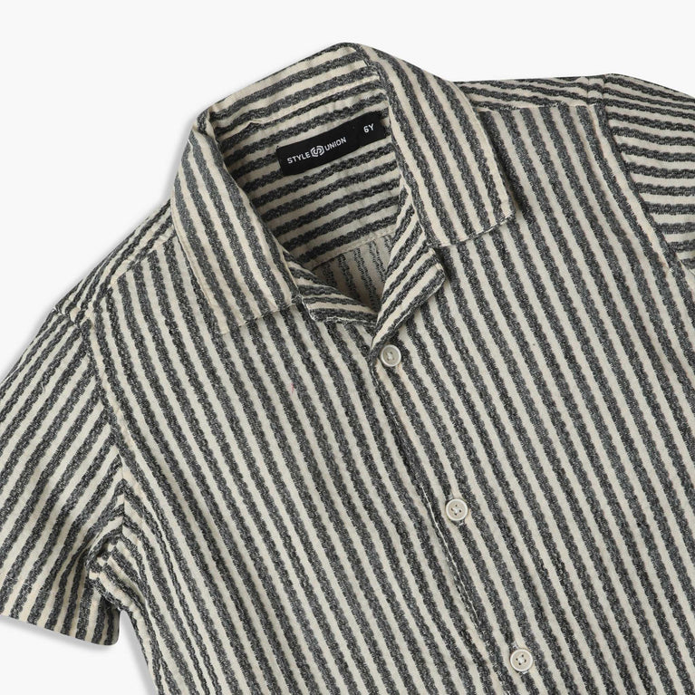 Experience the perfect blend of comfort and style with our Boys Striped Camp Collar Retreat Half Sleeve Shirt. Crafted from 100% cotton, this shirt ensures breathability and softness, making it ideal for all-day wear. The classic striped pattern and camp collar add a touch of sophistication, perfect for both casual outings and special occasions.