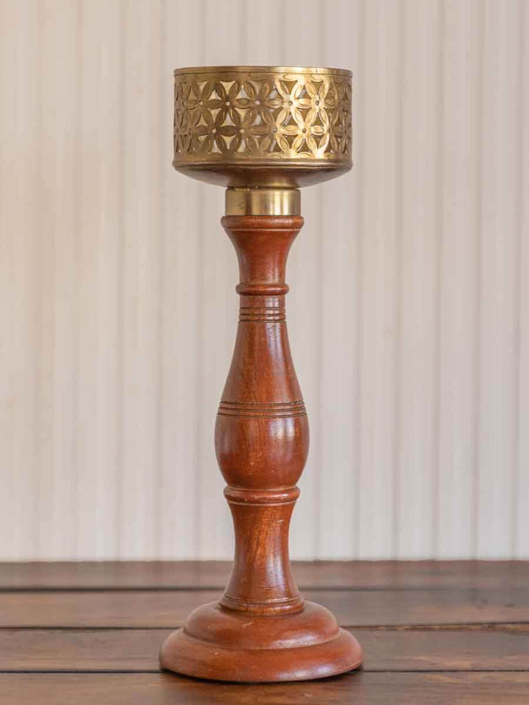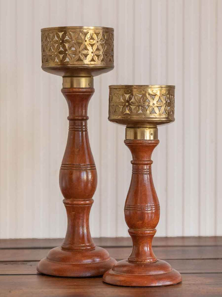 Set of 2 - Jwala Wooden Base Cutwork Metal Candle Stand