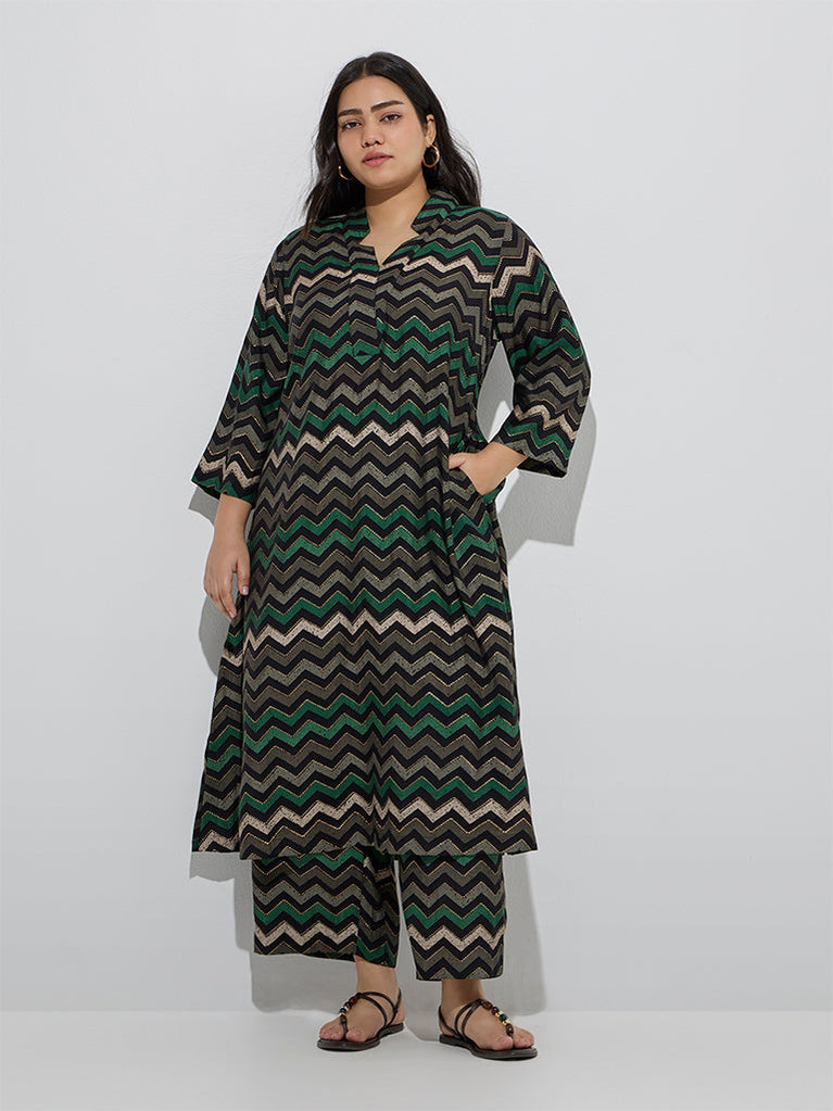 Revamp your ethnic wardrobe with this stunning black A-line kurta from Diza. Its captivating chevron patterns add a touch of modern artistry, while the breathable fabric ensures all-day comfort. Designed with a distinctive asymmetrical neck and elegant three-quarter sleeves, it's perfect for making a memorable impression.