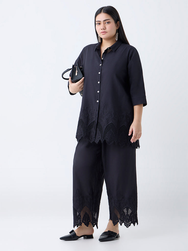 Add a sophisticated charm to your wardrobe with this black cotton tunic from Diza. Beautifully detailed with floral embroidery along the hem, it features a smart spread collar, a button-down front, and full sleeves. Perfect for creating an effortlessly elegant look for both work and casual outings.