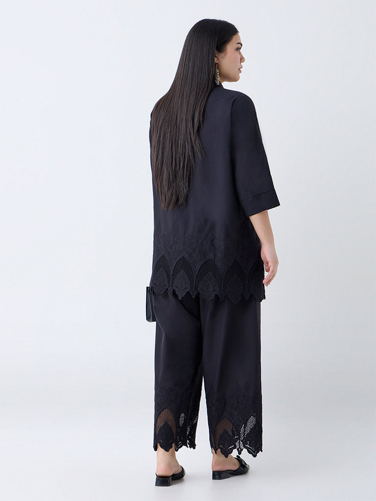 Diza brings this black tunic featuring intricate embroidery along the split neck and three-quarter sleeves for a refined ethnic appeal. It is crafted from soft, breathable fabric for all-day ease. A timeless addition to contemporary ethnic wardrobes.
