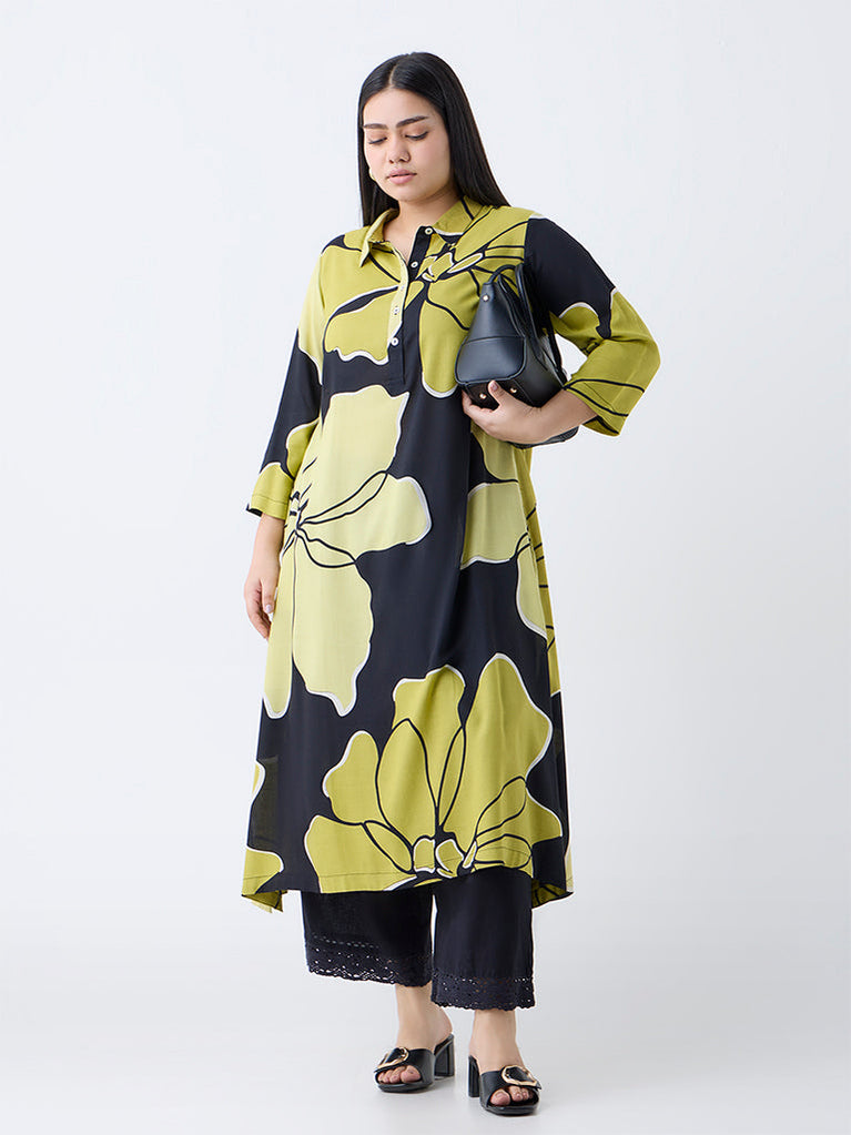 Diza brings you this charming black A-line kurta, featuring graceful floral prints that add a hint of femininity. Styled with a refined spread collar leading to a brief button-down front, three-quarter sleeves, and convenient side pockets, it combines effortless elegance with practical design.