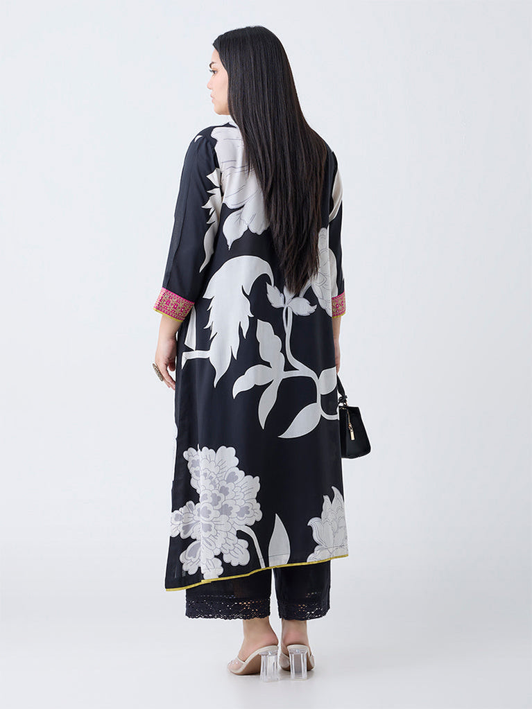 Diza Black Floral Embroidered Cotton A-Line Kurta