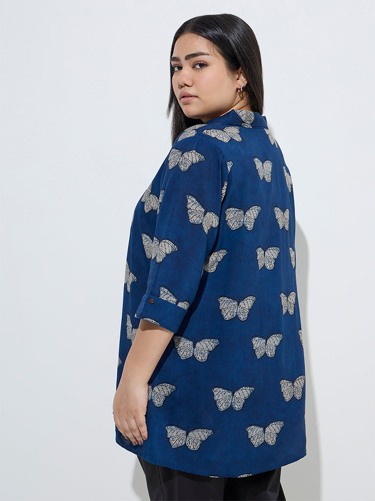 Crafted from a lightweight fabric, this indigo tunic from Diza is adorned with delicate butterfly motifs. Featuring a V-neck collar and three-quarter sleeves, it offers a breezy and elegant appeal.