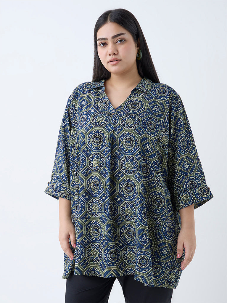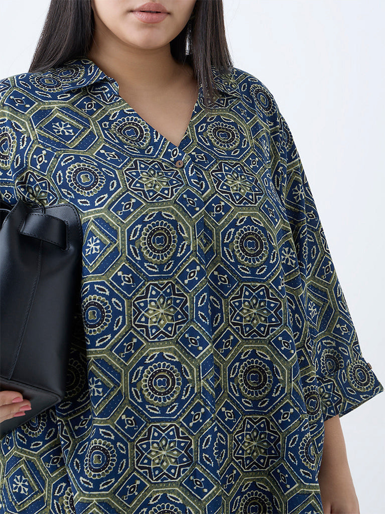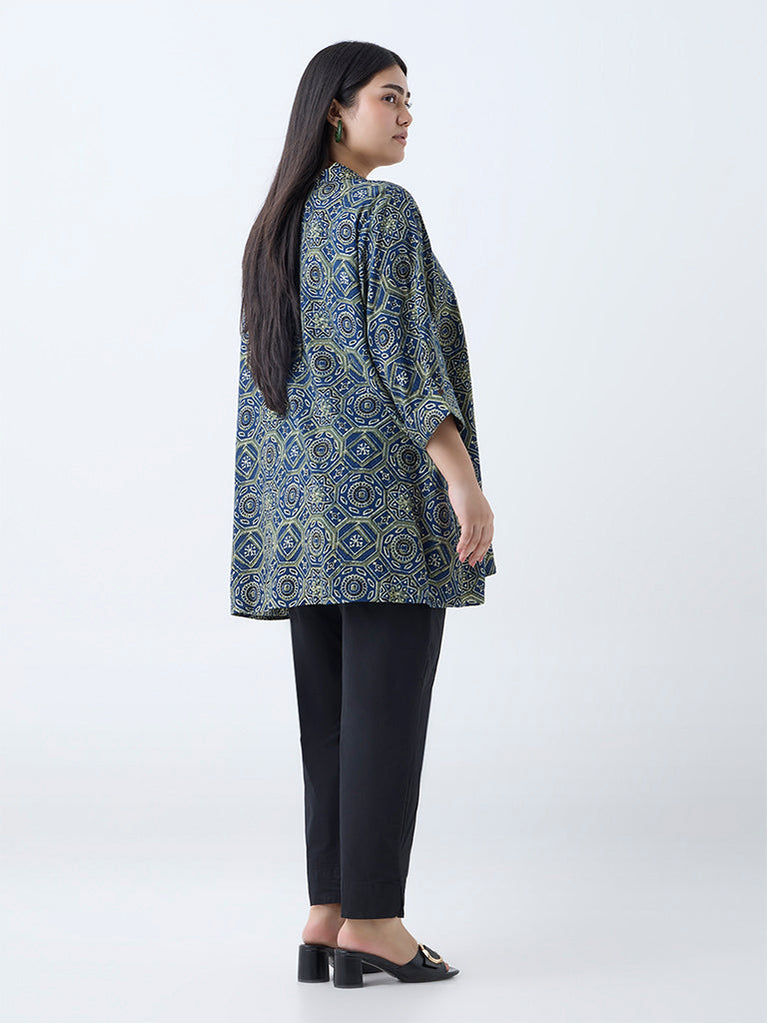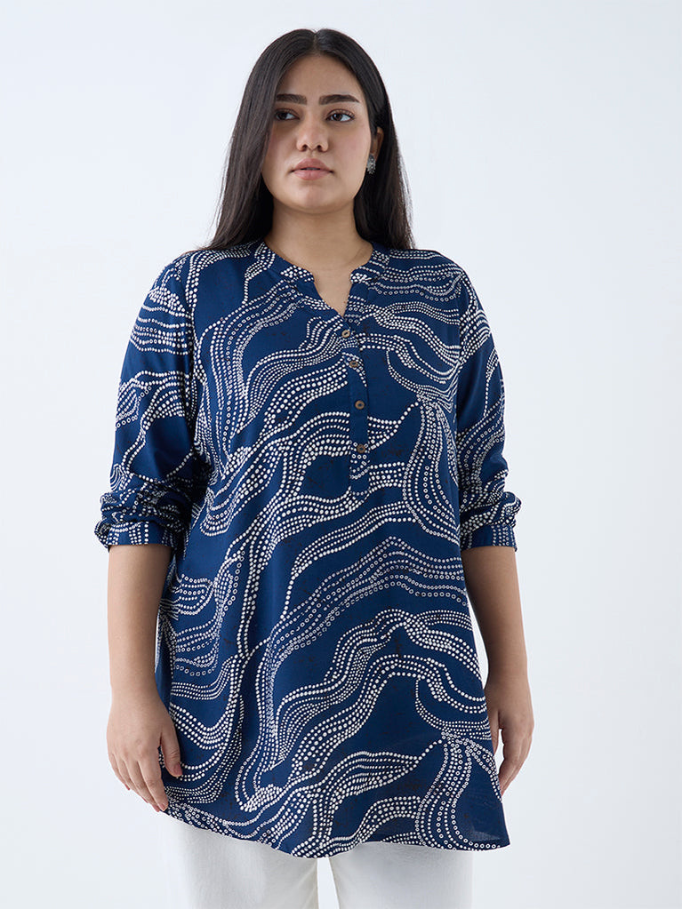 This indigo tunic from Diza showcases an all-over bandhani print that blends traditional charm with everyday ease. Designed with a notched neckline, a button placket and three-quarter sleeves, it’s a versatile pick for effortless day dressing.