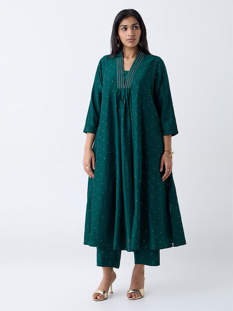 Diza presents this emerald green kurta standing out with its dainty embellishments across an A-line frame. Spun from a premium fabric blend, it features a V-neck and three-quarter sleeves for a composed finish.