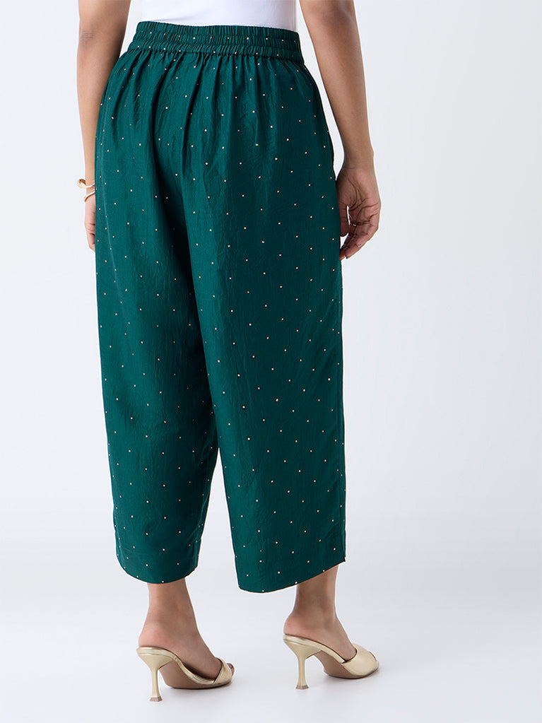 Diza introduces these emerald green ethnic pants, fitted with an elasticated waist and side pockets for a functional detail. Featuring dainty embellishments, they add a lively touch to everyday dressing and pair well with both solid and printed kurtas.