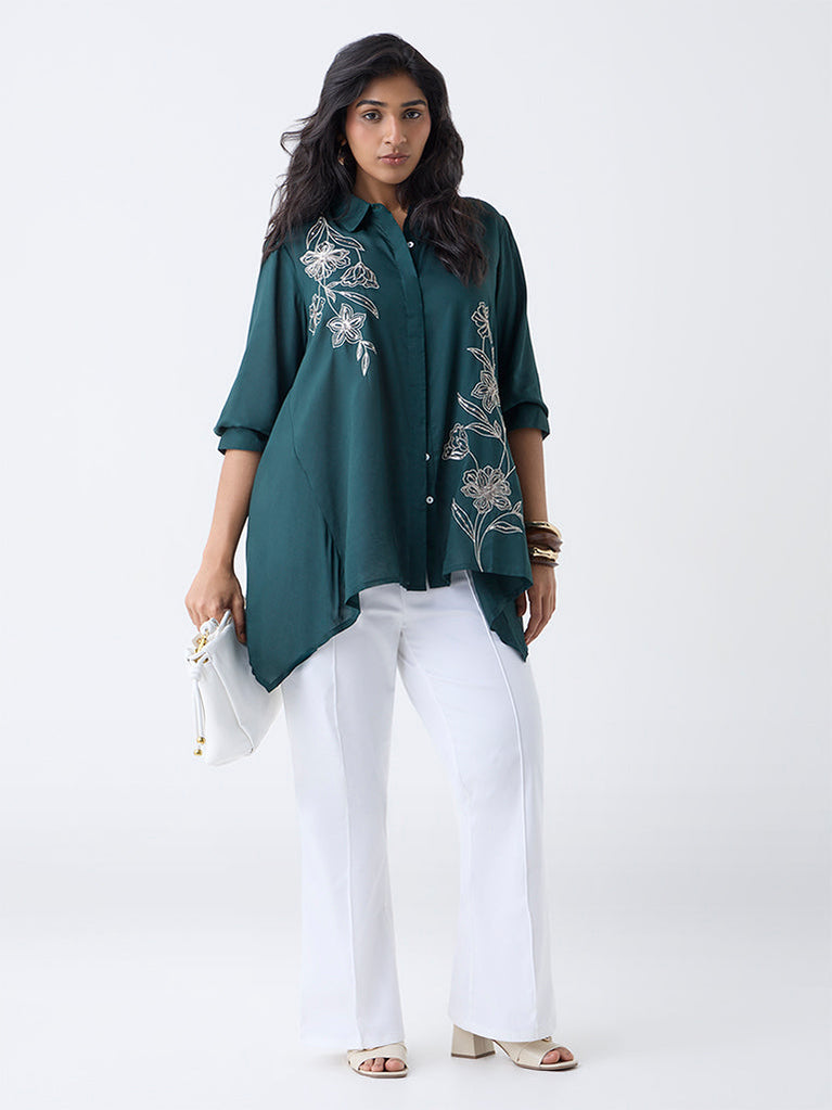 A celebration of colour and craft, this green tunic from Diza is enriched with sequin floral embellishments that catch the light beautifully. The asymmetrical hemline, spread collar and concealed button placket lend a chic edge, perfect for festive occasions or elevated daywear.