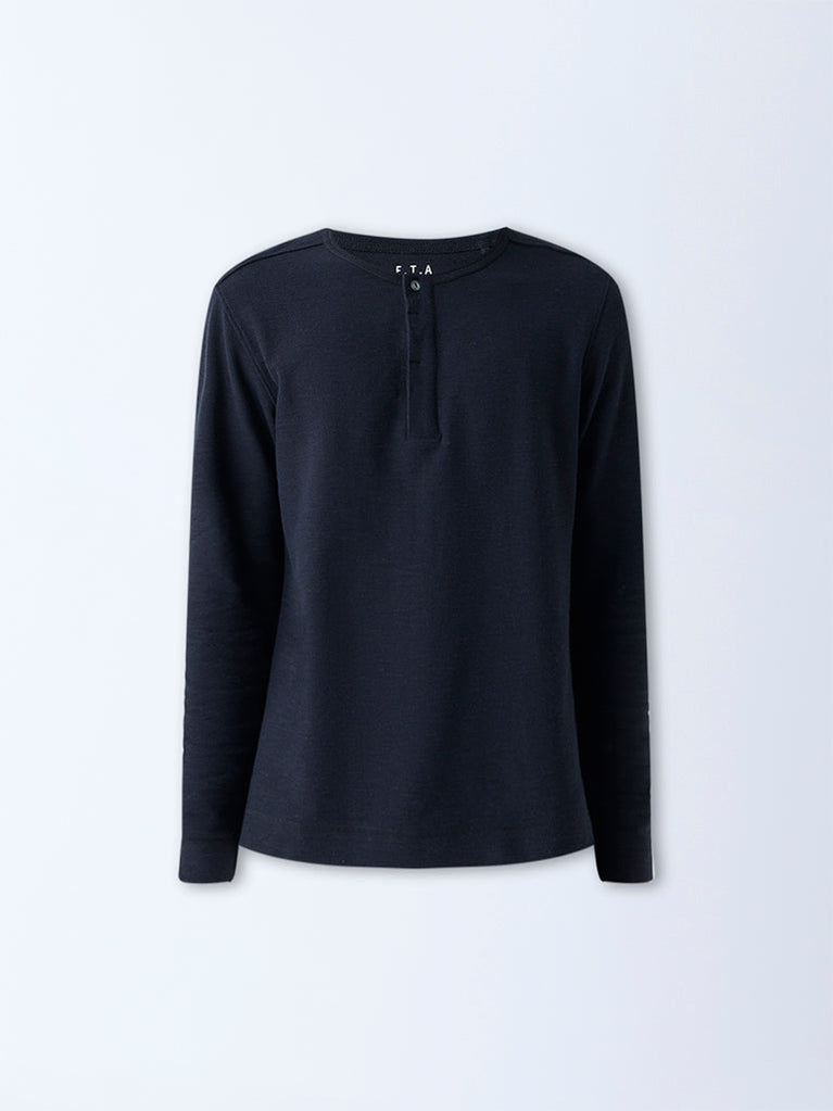 This black tee from ETA redefines everyday staples with a refined Henley neckline and a tailored slim fit. Milled from a cotton-rich fabric, it offers a clean silhouette that skims the frame with ease. The quarter button placket adds structure, while full-length sleeves bring a streamlined finish.