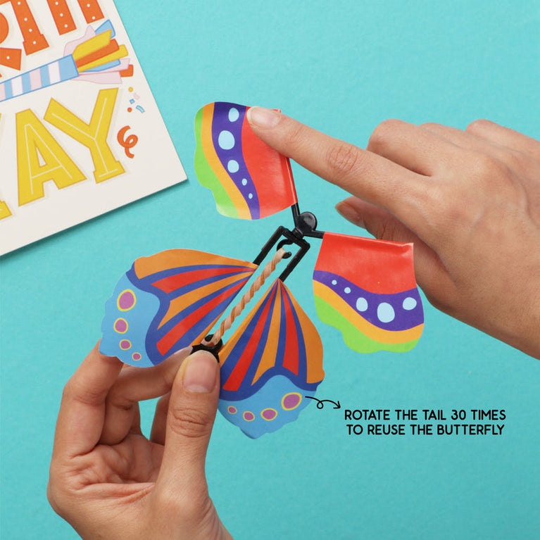 Specifications: Size of the card – 12 x 17 cm The card has to be opened with a mild jerk for best results. Sometimes, the butterfly tends to get tired during the shipment journey. If possible, we request you to open the card when you receive it and twist the butterfly’s tail the same way you rotate a key to recharge it. Once you’ve completed the motion 40-50 times, place it inside the card and close it.