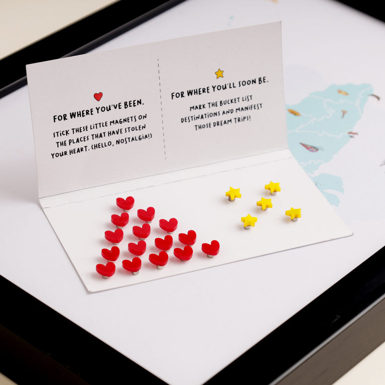 Each map comes equipped with 15 heart magnets to mark the places you've been to and 5 star magnets for the places on your bucket list. Whether you're the family’s self-appointed travel influencer or searching for the perfect gift for a travel lover, this map is all you need.