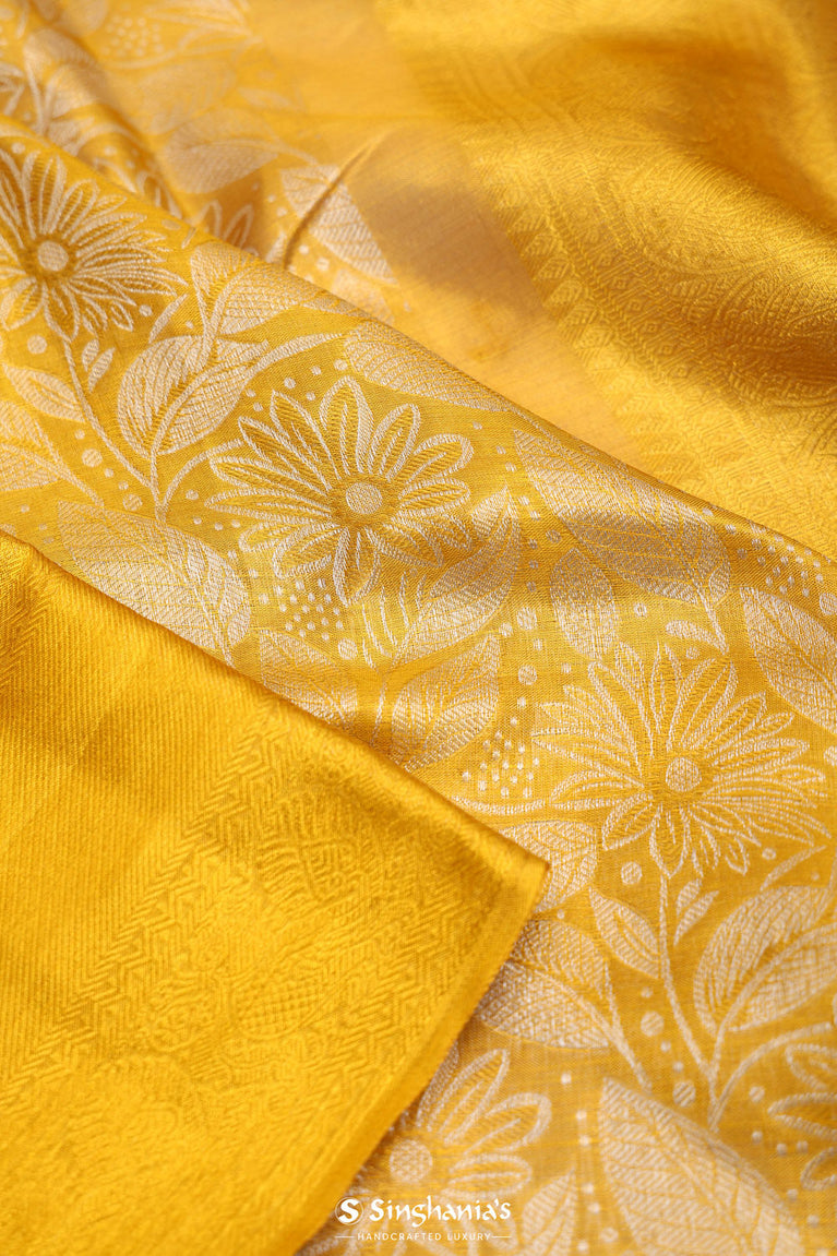 A luminous bright gold kanjivaram silk saree where the body features delicate floral jaal weaving in fine gold zari, complemented by a rich pallu displaying classical peacock and kaddi patterns. The broad border adds a fresh dimension to this timeless piece.