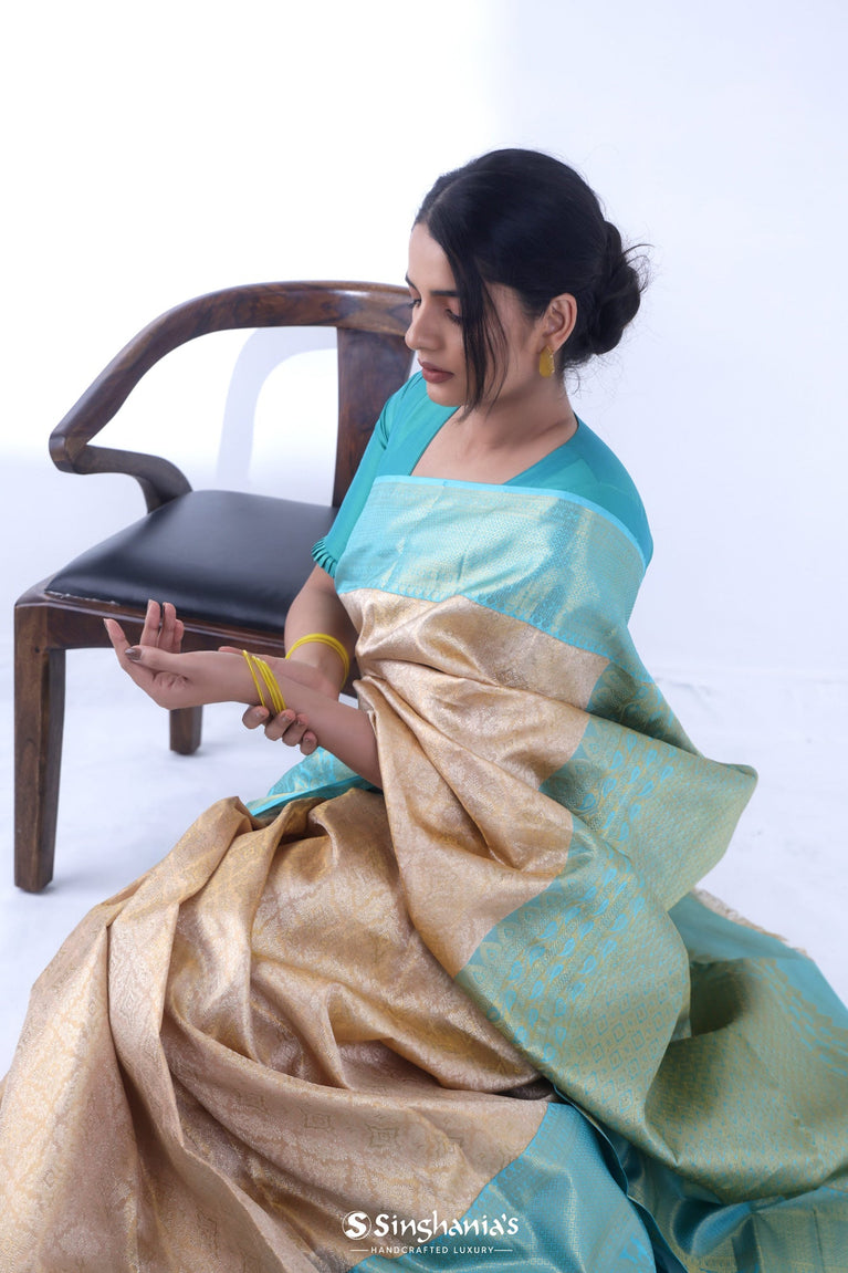 Cyan Blue Kanjivaram Silk Saree With Floral Jaal