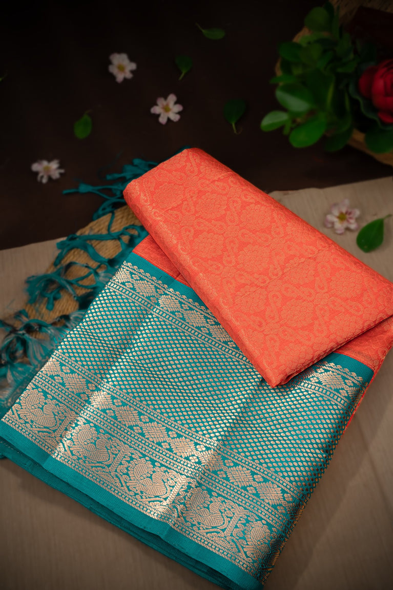 Mandir Peach Pink & Teal Kuppadam Floral Jaal Saree