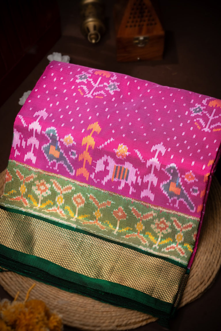 Mandir Pink & Green Ikat Ikat Saree